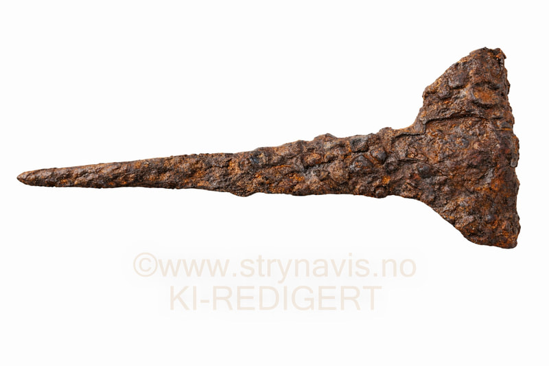 Gjenstanden på bildet ligner et kraftig, rustet jernredskap som godt kan være en type båtastrek eller lignende arbeidsredskap.