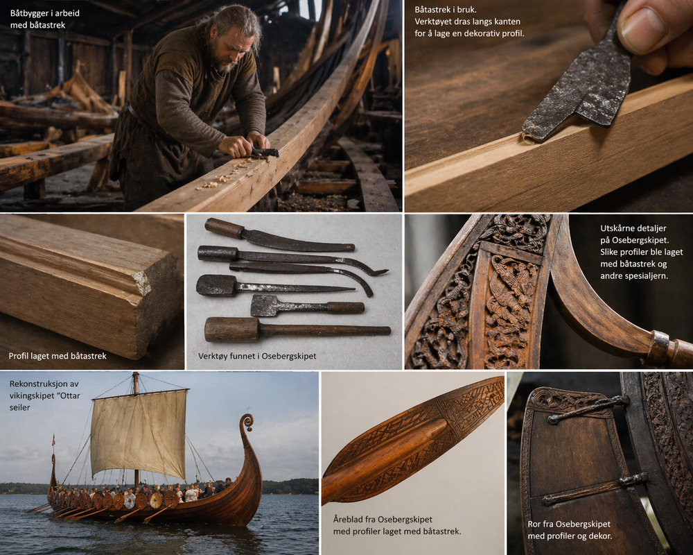 - «Alt i vikingtiden kjenner vi et lite verktøy som heter båtastrek. Det er et lite profiljern som ble brukt til å lage prydprofiler langs kantene av bordene.»