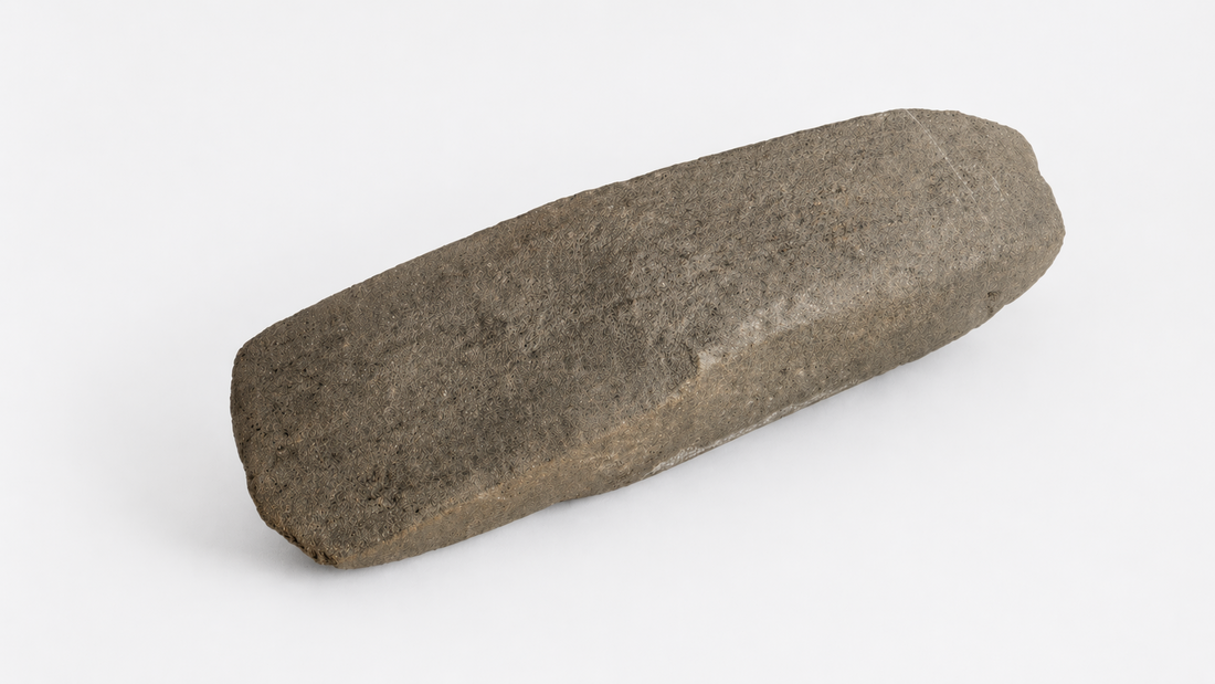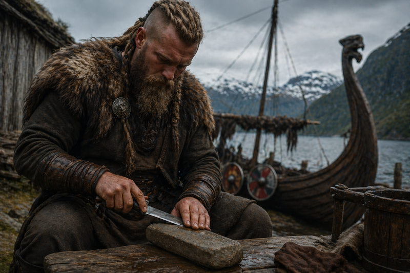 Steinen på bildet ser ut som en avlang håndholdt brynestein som kunne brukes direkte mot eggen med vann eller olje som hjelp under slipingen.